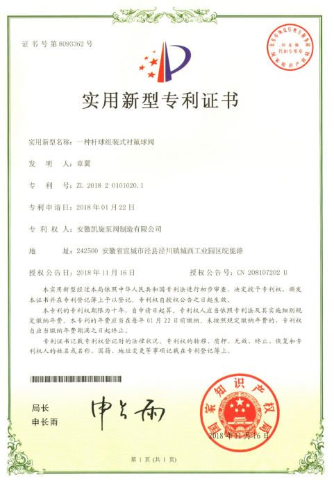 專利證書:一種桿球組裝式襯氟球閥